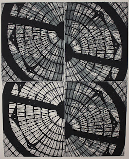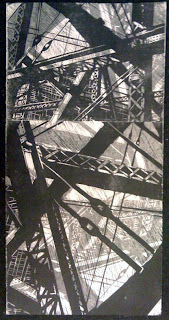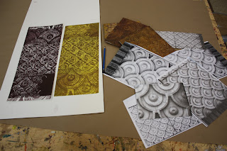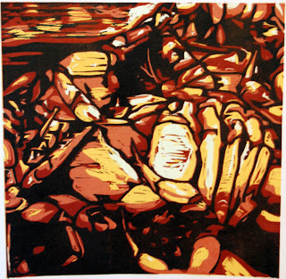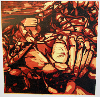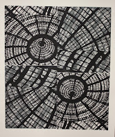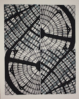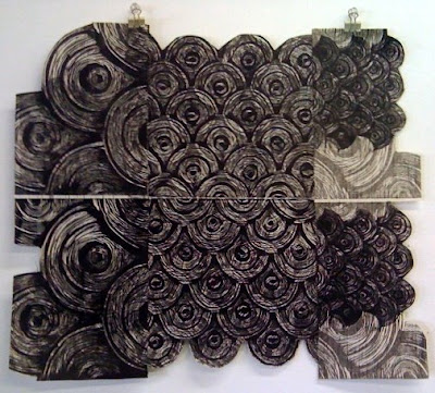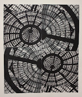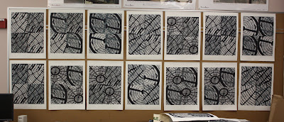 10 x 30" and 18 x 24" prints. Source material (future woodblocks) are on the left. These have a layered "ghost print" on top - I mixed a little blue in the black ink and printed the flipped image of each section.